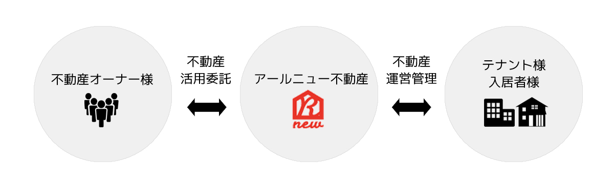不動産オーナー様から委託を受け、運営管理に関する業務をアールニュー不動産が受託し、不動産オーナー様の収益を最大限に高めていきます。
